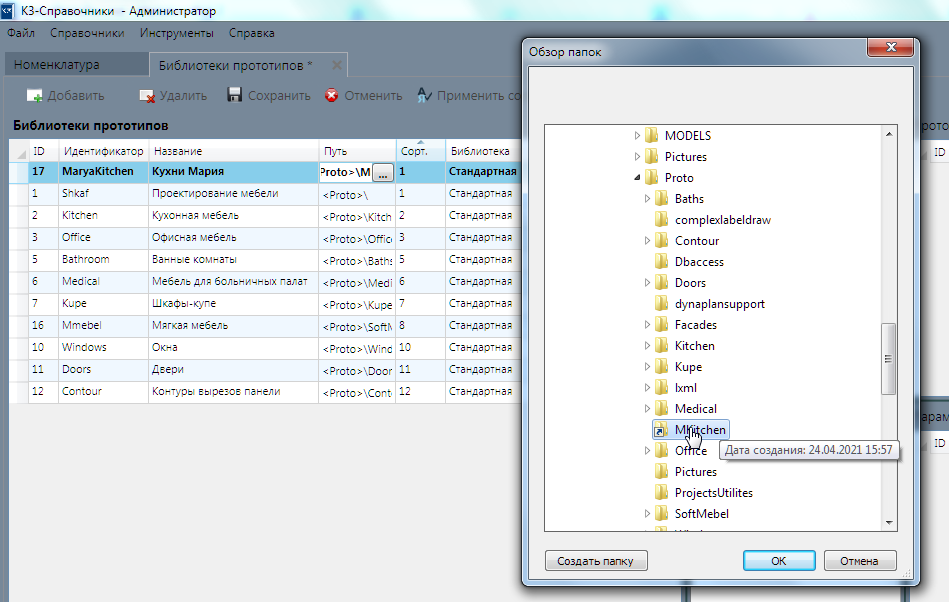 Создал папку для прототипов кухонь в стороне от штатной папки прототипов дистрибутива, которая по умолчанию находится в c:\ProgramData\GeoS\K3-Mebel PKM\8.0\Data\PKM\Proto . В папке Proto размещаем только символьную ссылку на папку в которой появятся нужные мне программы.