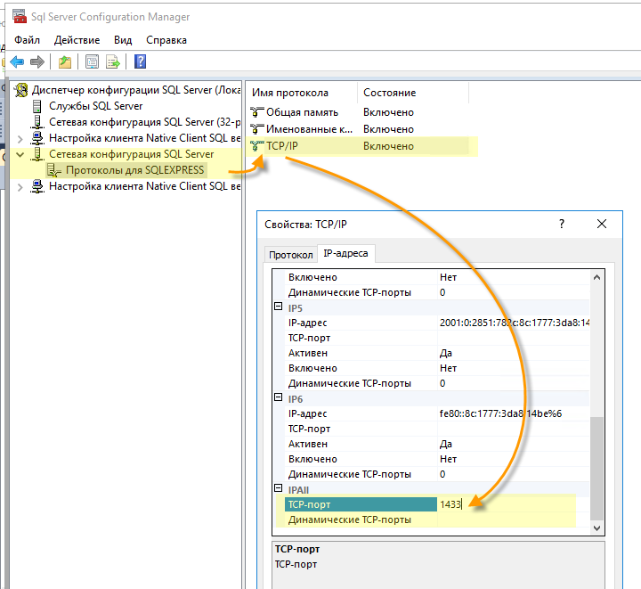 На сервере запускаем SQL Server Configuration Manager. Переходим в Сетевая конфигурация SQL Server—Протоколы для SQLEXPRESS (где SQLEXPRESS — имя экземпляра SQL Server). Прим. У меня так по началу и есть.